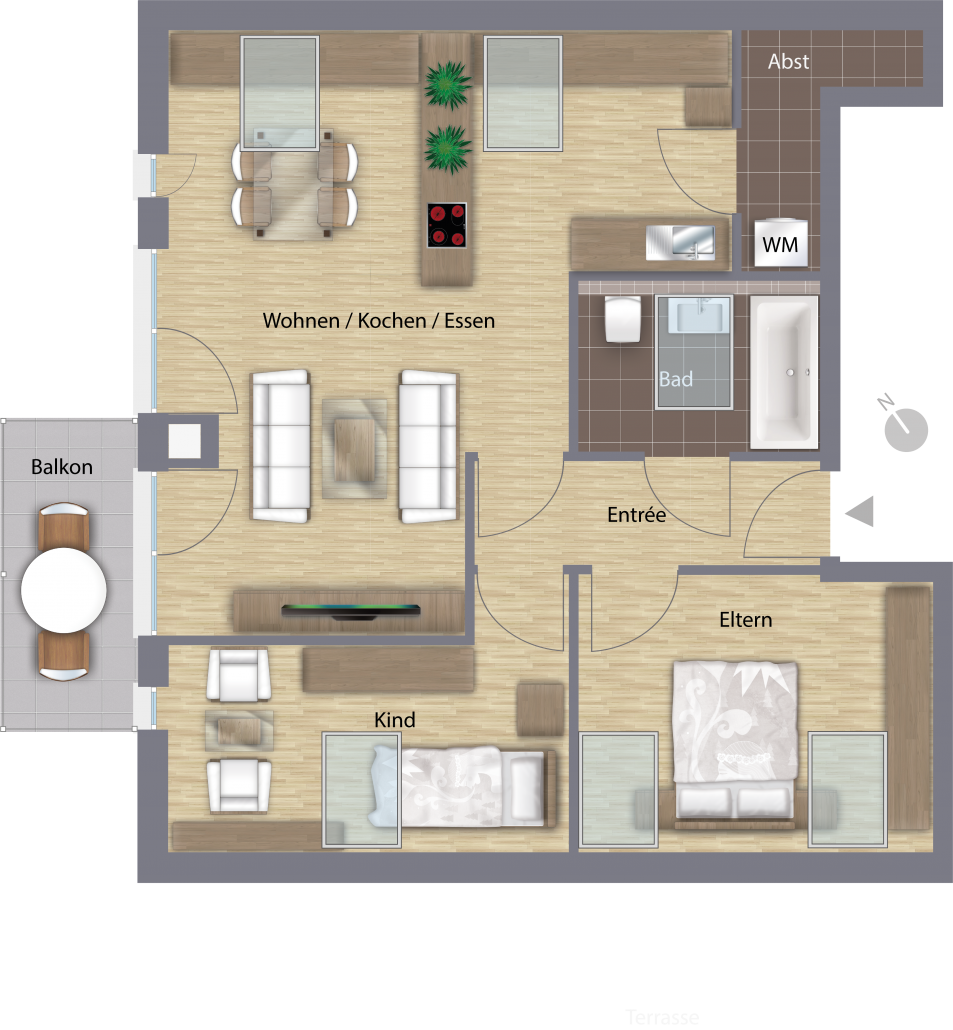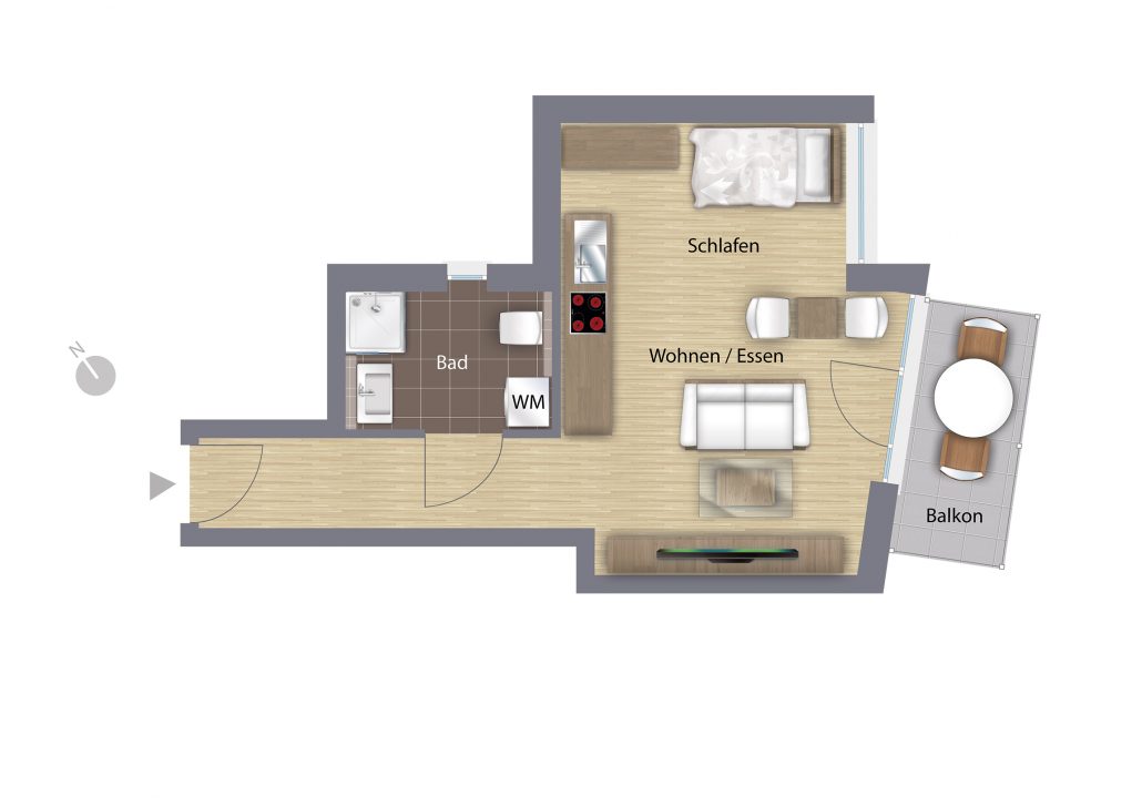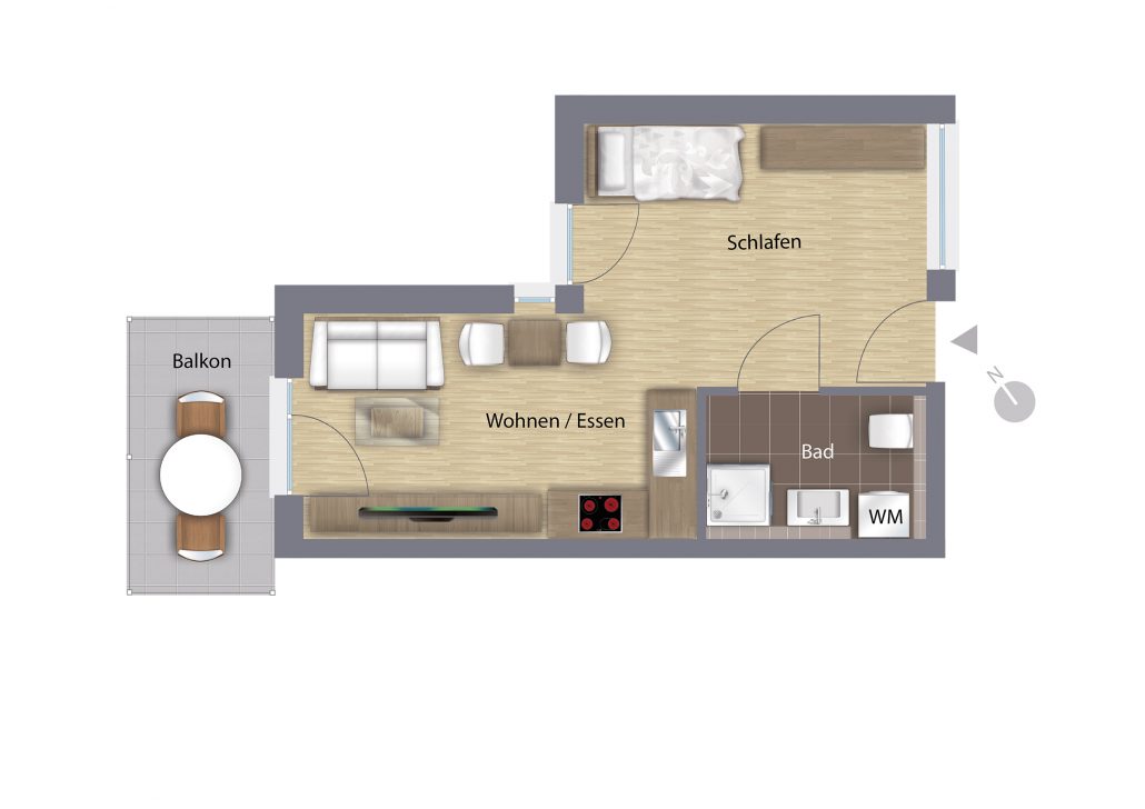 Hinweise: Die Sanitärausstattung ist exemplarisch dargestellt. Jede Wohnung verfügt über einen Waschmaschinen-Anschluss (WM). Abbildung nicht maßstabsgetreu. Mobiliar und Küchen sind nicht im Preis enthalten.